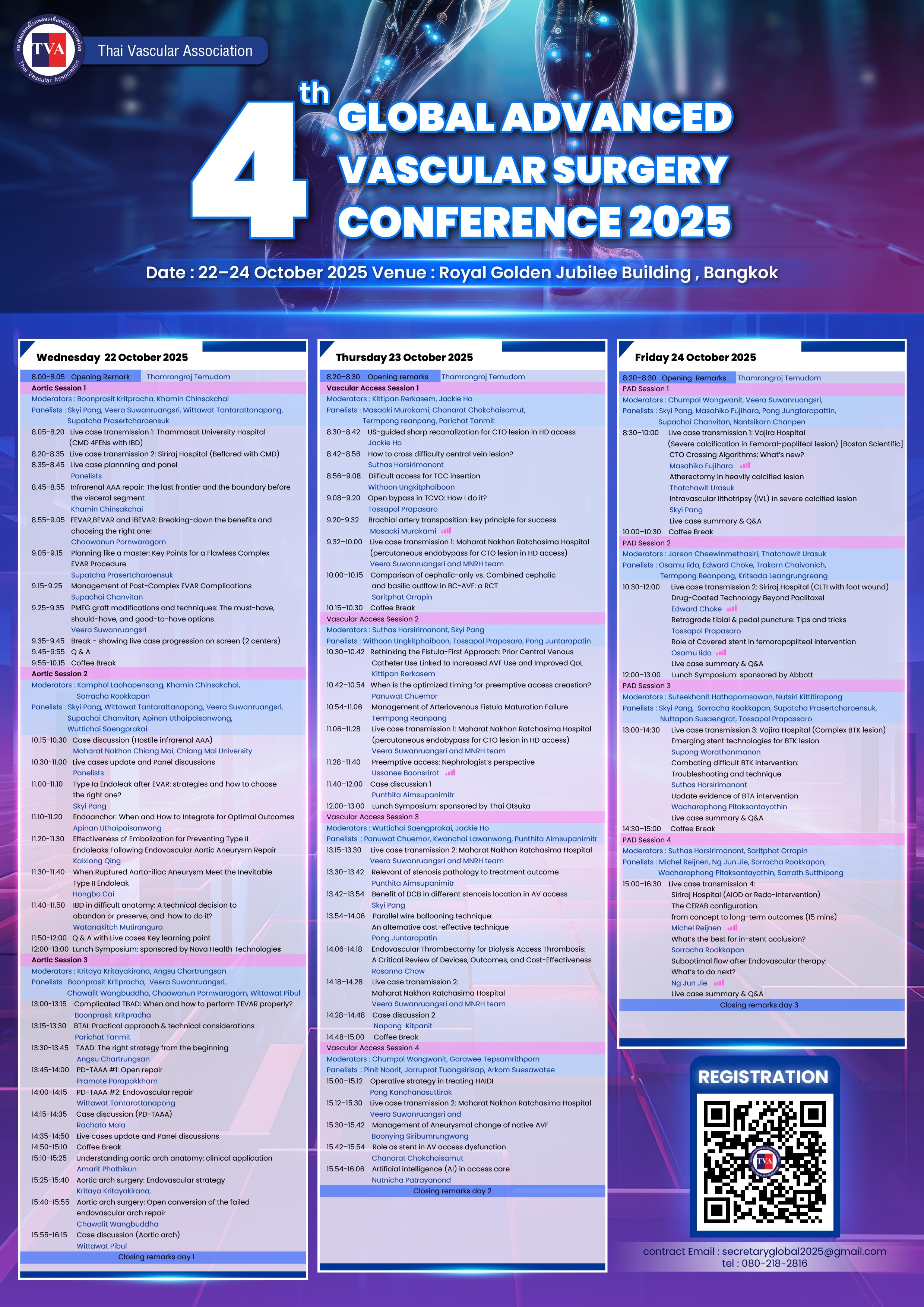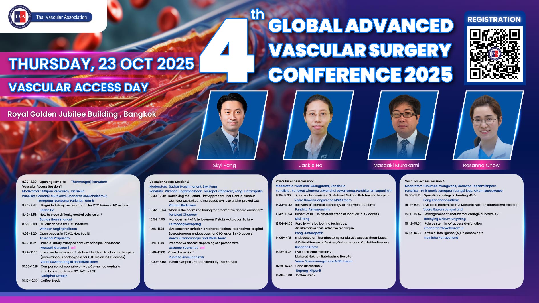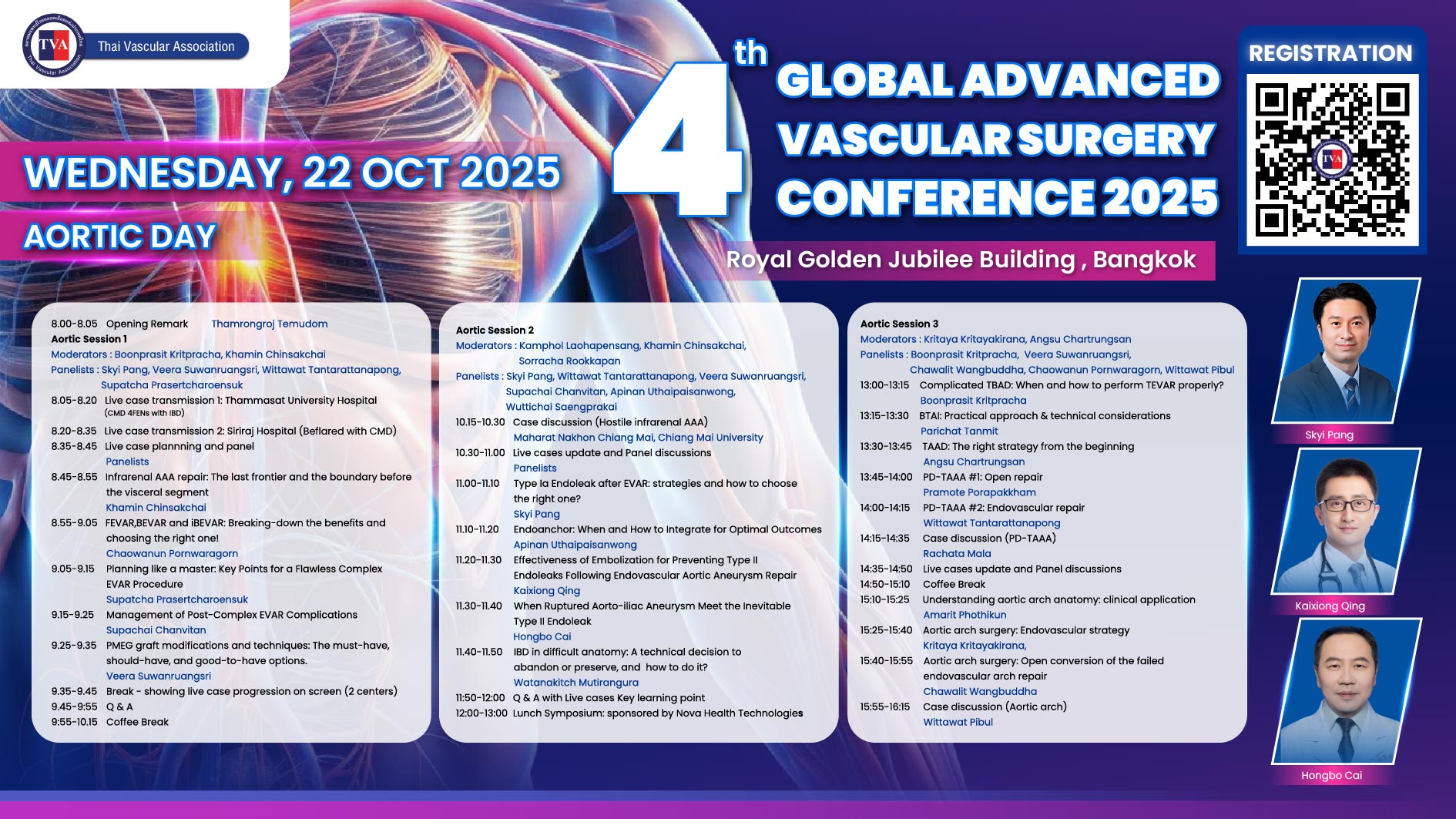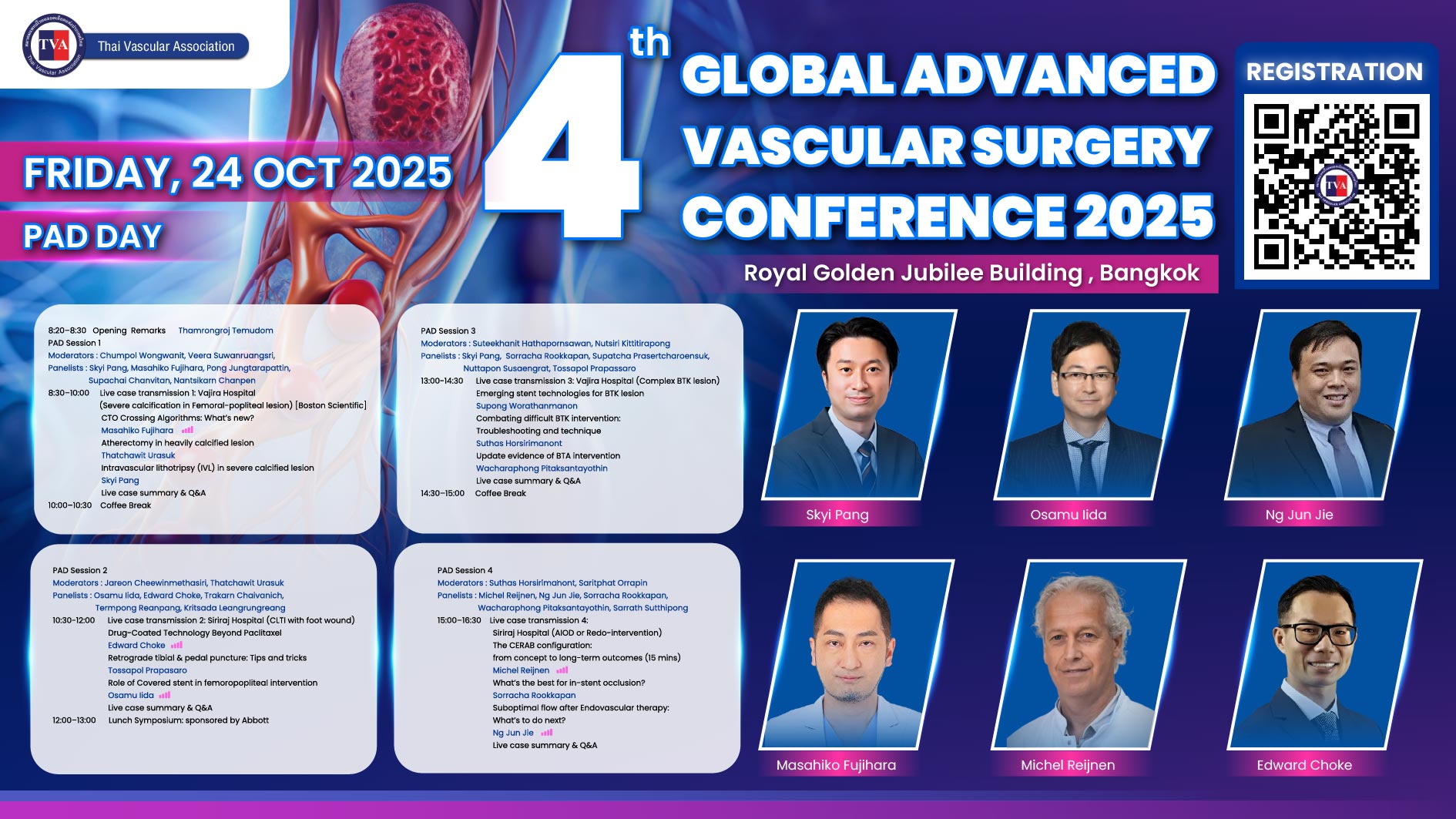 On behalf of the organizing committee, it is my great pleasure to welcome you to the 4th Global Advanced Vascular Surgery Conference 2025, held under the theme “Contemporary Vascular Surgery: Challenges, Innovation, and Collaboration” from 22–24 October 2025 at the Royal Golden Jubilee Building, Bangkok, Thailand.
